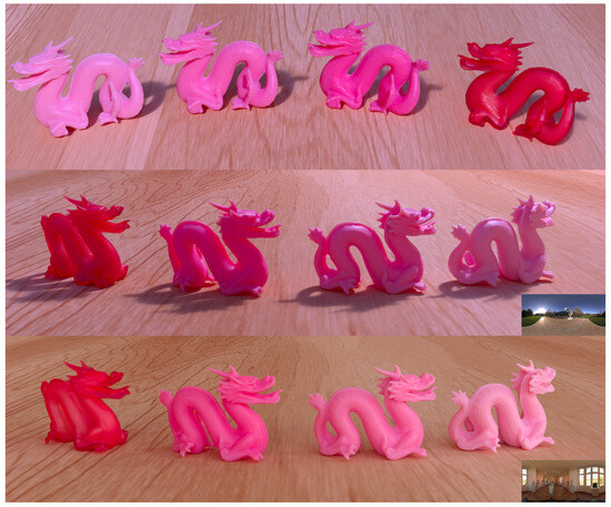 Predicted appearance of PolyJet 3D printed objects with different material mixtures of varying translucency (blending Vero Red and Vero Pure White). For the image at the top, the scene was set up to be qualitatively comparable to the photo in Figure 3. In the middle, the same scene is seen from a different view. At the bottom, we used a different lighting environment. The lighting environments are shown as small inserts in the lower right corner (the top and middle used the same).