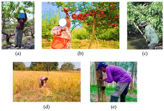 Typical agricultural tasks: (a) Manual pruning (reproduced under CC By 4) []; (b) Manual apple harvesting (reproduced with permission) []; (c) Manual mango harvesting with a pole (reproduced under CC By 4) []; (d) Manual rice harvesting []; (e) Manual rubber harvesting (reproduced under CC By 4) [].