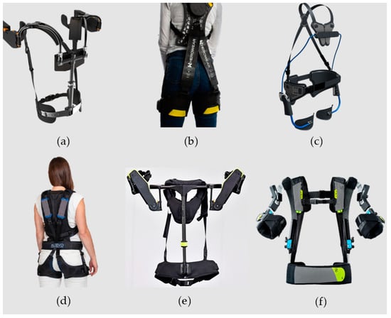 Commercially available exoskeletons (a) Levitate Exoskeleton [,]; (b) Herowear [,]; (c) Laevo V2.57 [,,]; (d) Auxivo Lift Suit [,,]; (e) H-Vex [,]; (f) Skelex 360 [,] (pictures courtesy of respective manufacturers).