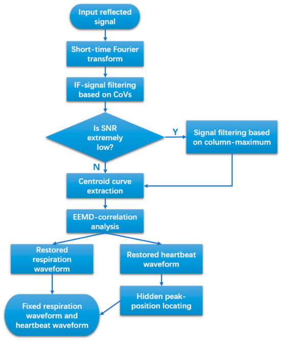 The flowchart of the algorithm of the proposed method, which mainly contains two new filtering methods and a new waveform restoration method, is shown in Figure 2. The reflected signal will be uploaded to a personal computer and transformed into time series data. The time series data will be analyzed using the short-time Fourier transform (STFT) method and filtered using the new algorithm based on the threshold of CoV. The system will thereafter check whether the SNR of the signal is high enough to enable the extraction of the centroid curve. If the SNR of the signal is much lower than the stipulated minimum SNR, then the system will perform further filtering based on the maximum of each time unit. After the centroid curve has been extracted, the ensemble empirical mode decomposition (EEMD)-correlation will be performed to obtain two preliminarily restored waveforms. Then, using the waveform-fixing algorithm and based on the hidden peak positions of the heartbeat waveform, we can obtain the respiration waveform.