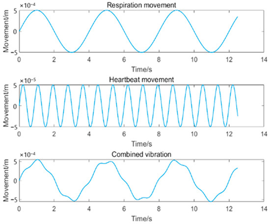 We can generate the simulated vibration signal as shown in Figure 3. Based on the reference respiratory and heartbeat rates and amplitudes used in related studies [21,22], we can consider the heart rate as 70 per minute and respiratory rate as 15 per minute, and their amplitudes as 0.05 and 0.5 mm, respectively. The amplitude of the vibration signal due to the heartbeat is the displacement of the chest wall caused by the heartbeat and not by the heart itself.