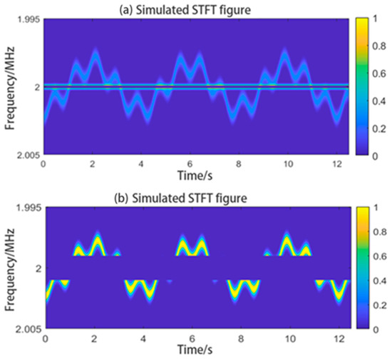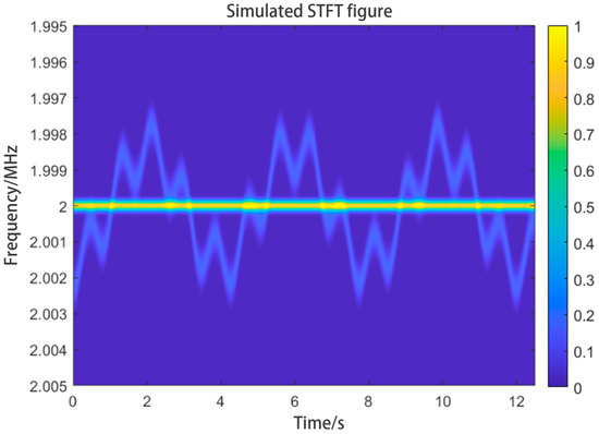 In Equation (3), if we set to 2 MHz, to Hz and u to m/s, the STFT plot of the signal obtained will contain the patterns of and as shown in Figure 4. The graph obtained using the STFT method will have time on the horizontal axis and frequency on the vertical axis. The graph will show the variation of the signal frequency with time. We can call this graph the “time–frequency graph”. We can analyze and extract information from the graph to obtain the velocity of the target. In practical applications, because of the reflectivity of the target and settings of the optical components, the time–frequency graph can contain an extremely bright lateral interference at . We call this IF interference. The simulated graph shows the IF interference.
