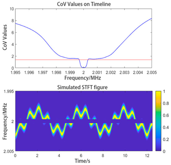 In Figure 6, the blue curve represents the CoV distribution, and the red line represents the CoV threshold selected. We can see many valleys near the 0-amplitude point in the CoV distribution, which correspond to the frequency of the IF interference. The CoV distribution at its outermost end has to be ignored because it provides no valid information. If the threshold of the CoV has been appropriately set, the signals in the frequency range within which the IF interference lies will be all filtered out, while those whose frequencies are outside that frequency range will be retained. This method can be used to filter out IF interference adaptively; it could also be used to filter out discretely distributed IF interferences. The method would not be significantly affected by the intensity of the IF interference. We can obtain the time–frequency graph of the signal after the IF interference has been filtered out, as shown in Figure 6.