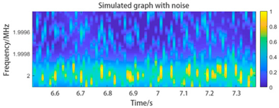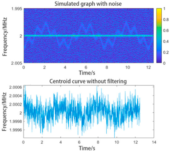 In related studies, the time–frequency graph has often been converted into a frequency–time curve using the centroid extraction method. However, in practical applications, because of the low SNR of the reflected signal, the graph may include considerable noise. We noticed random noise in the graph caused by the low reflectivity of the target. This low reflectivity submerges the highest intensity peak in the spectrum of the reflected signal in noise. Even the valid information can become intermittent. We added simulated noise to the graph, as shown in Figure 7.
