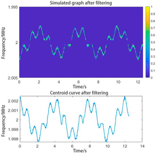 We can consider the waveform shown in Figure 4 as a mixture of the waveforms of the intermediate frequency and velocity signals, and extract the required waveforms from the velocity signal waveform. Related studies [23] used the centroid curve extracting method to obtain curve data from images. The method we used can extract only one waveform from the waveform shown in Figure 4, and we need to first filter out the intermediate-frequency waveform from it. According to most of the related studies, using a filter with a preset-frequency range, we can remove the signals falling within that range. We chose to filter out signals falling within two different preset-frequency ranges, and the results are shown in Figure 5. We can see that if the frequency range is not correctly chosen, there will be residual IF interference, or the signal would be filtered to such an extent to affect the extraction of the centroid curve. In a worse situation, there could be more than one IF interference signal, making it impossible to predict the frequency ranges of the filters.