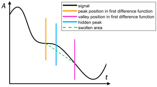 In this paper, we propose a waveform correction method based on the signal-difference and period-average values. First, we calculate the first difference function of the heartbeat waveform. According to mathematical principles, between the peak and valley of the first difference function of the original heartbeat waveform, a swell will be present, as shown in Figure 11. The orange line in the figure marks the position of the peak in the first difference function, while the purple line marks the position of the valley in the function.
