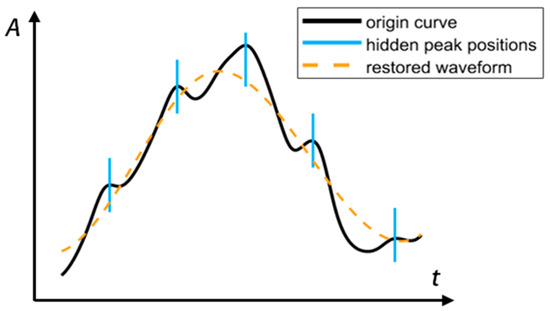 The swell between the orange and purple lines indicates a hidden peak at the position of the swell. The green dotted line demarcates the swollen area. The point at which the largest difference between the green dotted line and the waveform above it exits is marked using the blue line. We can assume that the blue line marks the exact location of the hidden peak. It is easy to notice that the exposed peaks can also be marked, so this method can be used to mark the positions of all peaks in the waveform. We can similarly mark the valley positions using a red line, as shown in Figure 12 (because the waveform has been restored well, no hidden peaks have to be added. More comparison is in Section 3).