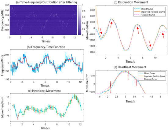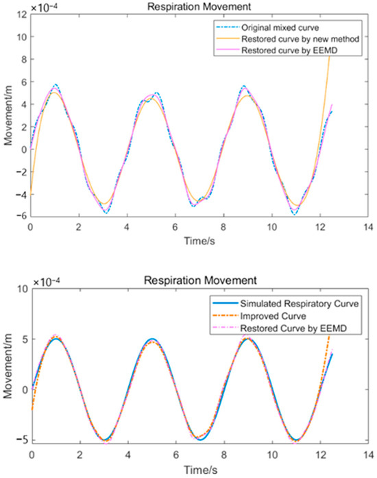 The restoration of the heartbeat waveform using the traditional EEMD method will not work well because of the presence of low-frequency signals in the waveform. These low-frequency signals make it difficult to locate the position of each peak in the heartbeat waveform and distort the respiratory waveform, but we located almost each peak in the heartbeat waveform using the method in Section 2.2.3, as shown in Figure 18c. We can notice that the heartbeat waveform restored by traditional EEMD method contains a lot of drift. This will make the respiratory waveform distorted. In addition, we overlaid the respiration waveform with the mixed curve (which was extracted from the time–frequency plot containing multiple frequency components). We found that the original respiration waveform did not pass through the mixed curve, which would have resulted in mode mixing to some extent. In Figure 18d, the points in the pink waveform at which arrows are placed are distorted. The original respiratory waveform is too high or too low, such that it bypasses the mixed waveform.