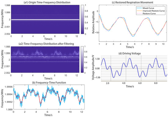 The graph and curve being processed are also shown in Figure 17. First, we obtained the origin time–frequency graph with strong IF interference, as shown in Figure 17a1, which made the valid information nearly undetectable in the normalized view. Then the time–frequency graph was filtered by a method based on CoVs to remove the IF interference, as shown in Figure 17a2. The centroid curve was extracted from the graph. By removing the IF interference accurately, the graph can be processed better. The centroid curve extracted and smoothed from the time–frequency graph is shown in Figure 17b. We can see that the centorid curve shows clear geometry features. It is interfered with by the IF interference as little as possible. After decoupling and waveform-fixing, we can obtain the low-frequency waveform as the respiratory waveform, as well as the fixed respiratory waveform. These waveforms are shown in Figure 17c.