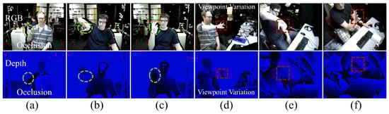 Existing challenges in HPE: (a–c) serious occlusions and (d–f) variations in hand appearance from different viewpoints. Some of or even most parts of the hand are missing in these scenarios, resulting in difficulties in HPE. The top line shows RGB images, while the bottom line presents the corresponding depth images.