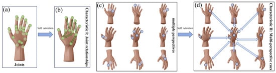 Two key characteristics are revealed from the observation of hand images. Characteristic I: (a,b) represent the inherent relationships between hand joints. Characteristic II: (c,d) indicate the multi-perspective cues of the hand. These relationships and cues can be computed using a self-attention mechanism.