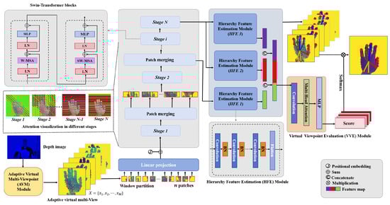 The pipeline of the MPCTrans model is illustrated in Figure 3. The proposed MPCTrans model consists of four components: the AVM module, the backbone, the HFE module, and the VVE module. The first component, i.e., the AVM module, adaptively generates M optimal virtual multi-view depth images. The second component is the backbone of the feature extraction. It captures joint relationships of the hand. In this work, the Swin Transformer [] was employed as the backbone due to its effectiveness in capturing long-range semantic dependencies in hand depth images, such as dependencies between fingertips and finger roots, by using a shifted windowing scheme. The backbone is further enhanced with dropout layers to mitigate overfitting. The third component, namely, the HFE module, leverages multi-layer and multi-scale information to estimate hand poses accurately. The final component, i.e., the VVE module, assesses the virtual viewpoints and reveals the multi-perspective cues in hand images. Given the pose estimates and evaluation results from M views, we can fuse them to obtain the final hand position prediction.