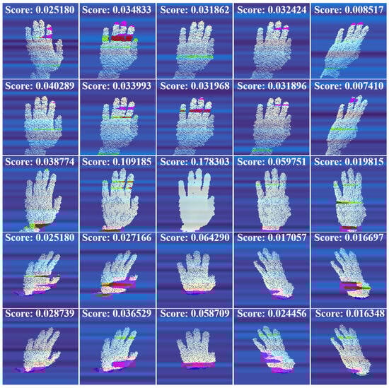 To reduce computational cost, the output of the three HFE modules is concatenated and fed into the high-level function. The VVE module employs CNNs to extract features and applies multi-head attention [] to merge the multi-view features. An MLP layer then maps the features of each view to a scalar value. As shown in Figure 5, each perspective contributes differently to the final hand pose prediction, resulting in different results.
