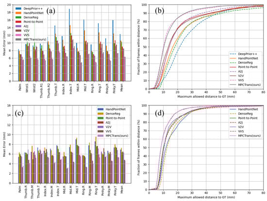 Comparison of the MPCTrans model with state-of-the-art methods (DeepPrior++ [], HandPointNet [], DenseReg [], Point-to-Point [], A2J [], V2V [], VVS []) on the NYU and ICVL datasets. (a,b) Mean joint error per hand joint and percentage of successful frames over different error thresholds in the NYU dataset. (c,d) Mean joint error per hand joint and percentage of successful frames across various error thresholds in the ICVL dataset.