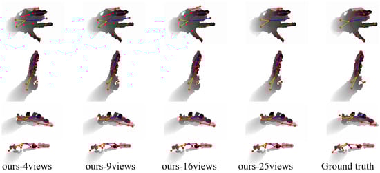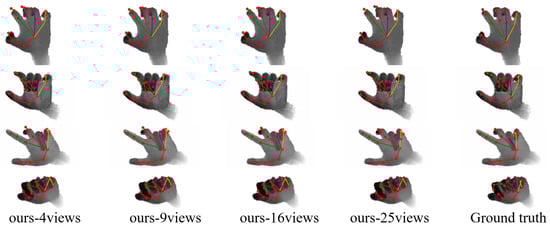 Figure 9 visualizes the results of the MPCTrans model with different numbers of adaptive virtual multi-views on the ICVL dataset. To make viewing joints and their connections easier, the hands in these illustrations are shown in grayscale. As the number of views increased, our method became more accurate in predicting the occluded areas of the hand. This improvement is particularly noticeable in the first and third rows.