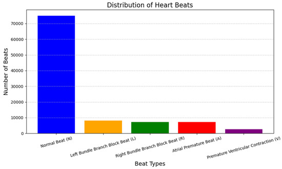 Figure 2 presents the distribution of sample data instances used in this research. The following figure shows the proportions of different instances of ECG signals belonging to different categories of cardiac arrhythmias that are included in the database. The specific reason for choosing the MIT-BIH Arrhythmia Database for our study on denoising ECG data is because of the following inherent advantages [14]. Because of its large size, the variance in the beats, and the detailed annotation, the database is suitable for evaluating the performance and robustness of several denoising methods depending on the noise level and type of arrhythmia. Our objective was to develop and validate methods for denoising ECG signals to enhance patient care and diagnostic accuracy, leveraging this extensive and well-annotated resource. In addition to denoising, we performed classification tasks on the ECG data to further validate the effectiveness of our denoising techniques [30]. The classification required searching for noise-free ECG signals in specific cardiac disorders such as ventricular tachycardia, ventricular fibrillation, atrial flutter, and premature ventricular contractions, among others. Matrix generation evaluated metrics such as precision, recall, F1 score, and accuracy. This comprehensive approach allowed us to compare results and demonstrate the improvement in classification performance due to effective denoising. Finally, it helped with better diagnostic accuracy and patient care for the response.
