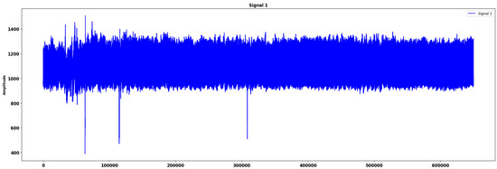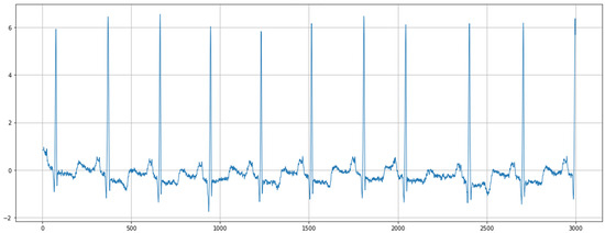 Our dataset consisted of ECG signal segments, each lasting 30 min. In the first preprocessing step, we reduced the sample size to 3000 samples per segment to simplify the data and optimize computational efficiency without significant information loss. Figure 4 represents the ECG signal after the segmentation.
