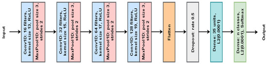 The hyperparameter-tuned 1D MLCNN model for ECG classification is depicted in Figure 5. The modified MLCNN architecture consists of Convolution Layers, max-pooling layers, dropout layers, and dense layers. This figure illustrates the architecture and changes in our MLCNN model that provide the model with the ability to extract the required features and decrease its complexity for analyzing ECG signals. The deep learning model identified in our study is a modified lightweight MLCNN model that was developed to be used in the denoising and classification of ECG signals. Our architecture is based on modified lightweight MLCNN, but certain changes were made to improve the extraction of features and reduce the complexity of the network. Unlike conventional deep learning models, the model has layers but pays special attention to the smaller details of the ECG signal and is computationally fast.