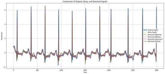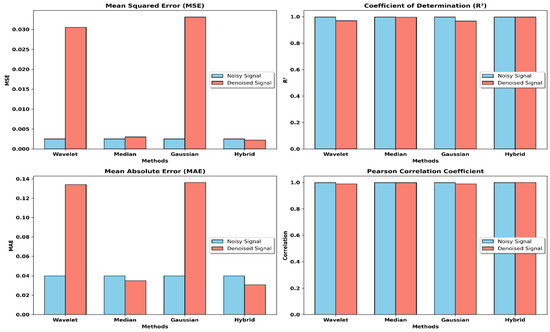 Figure 9 demonstrates a relative analysis between the original signal and the noisy signal and the utilized denoising techniques such as the wavelet, median, Gaussian, and hybrid methods. It indicates the quality signal improvement after the application of each of the denoising methods. These quantitative measures also provide evidence of the denoising capability and show the decrease in mean squared error (MSE) and mean absolute error (MAE), besides the increase in the coefficient of determination (R2) and correlation coefficient. These results validate our method of improving the interpretability and diagnostic ability of ECG signals with better results than the existing methods.