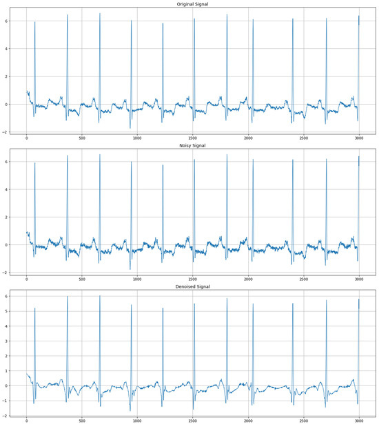 MIT-BIH Arrhythmia Database is one of the most famous databases in biomedical signal processing, especially for electrocardiogram (ECG) signals. This database was acquired from the Massachusetts Institute of Technology (MIT) and Beth Israel Hospital, Boston, the famous hospital that possesses a valuable database obtained from ambulatory ECG recordings [26]. The dataset includes 48 half-hours from 47 persons in 1975–1979. Every recording involves detailed annotation that allows requisite information on beat-to-beat rhythm and assists in the recognition of different forms of cardiac arrhythmia. The ECG recordings are taken at 360 samples per second per channel so as to have an accurate recording of the cardiac electrical activity [27]. The signals are digitized with 11-bit resolution across a range of 10 mV, maintaining minute nuances in the waveform shape that are critical for accurate diagnosis. Each pulse in the database is annotated to indicate the start, middle, and end of each beat, along with rhythm annotations for each recording, provided by board-certified cardiologists [28]. Thus, one of the main advantages for researchers using the MIT-BIH Arrhythmia Database is the wide spectrum of arrhythmias recorded in the files. The dataset involves cardiac disorders, including ventricular tachycardia (VT), ventricular fibrillation (VF), atrial fibrillation (AF), atrial flutter (AFL), and premature ventricular contractions (PVCs). Such variations enable a thorough examination of algorithms’ performance across diverse scenarios that might be faced in actual clinical practice, thus making the dataset diverse [29]. The MIT-BIH Arrhythmia Database has been widely used and cited over the years for its historical significance and for the fact that it remains relatively easy to apply to ongoing research and comparisons made over several decades. While the MIT-BIH Arrhythmia Database offers extensive and well-annotated data for arrhythmia research, certain limitations may impact the generalizability of this study’s findings. The dataset’s demographic and technological context is outdated, representing a limited population sample from the 1970s, which may not fully reflect present-day or broader populations. Further, the kinds of artificial noise that were introduced in this paper might not represent the unpredictable noise that appears in real clinical environments where wearable and portable devices meet a variety of environmental interferences. Such factors indicate that future work that includes more diverse and modern datasets could improve the usability of the denoising methods across a broad range of clinical and real-time settings.