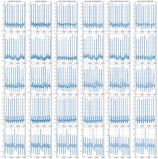 In our study, data preprocessing can be said to play a big role because it allowed for the ECG signals to be cleaned and made ready for denoising and classification. The ECG signals in the MIT-BIH Arrhythmia Database were preprocessed through several steps in order to make them suited for analysis and to enhance the results of the latter and the performance of the algorithms used here. Initially, the records in the form of the ECG signal were split into single beats. This involved obtaining the R-peaks of the QRS complexes using a peak detection technique. Each detected R-peak was used as a starting point for obtaining segments of constant duration that started and ended at predefined points relative to the R-peak in order to guarantee that segments contained an entire cardiac cycle [31]. This was one of the ways this work made sure beat-to-beat fluctuation could be captured while the input data were kept consistently clean for denoising and classification. After that, we introduced several sorts of synthetic noise to the original, unaltered “clean” ECG signals because many ECG signals are influenced by noise in practical applications [32]. The types of noise added included Gaussian noise, salt and pepper noise, speckle noise, uniform noise, and exponential noise. The different types of noise were also introduced at varying intensity levels to yield a rich database that helped the authors test different denoising techniques [33]. To make the interferences more realistic, different types of artificial noise were chosen depending on the frequency spectral characteristics observed in ECG signal interferences. For example, Gaussian noise was applied to model random electrical noise that may take place at the time of signal acquirement from sensors as a result of some constraints in the devices or other factors. The addition of salt and pepper noise was applied to emulate random momentary variations in signal amplitude associated with electrode movement or signal interruption in ECG signals. Speckle noise best illustrated fluctuations in attempts and variations due to electronic irregularities, power inconsistencies, or interference with other electronic devices, and uniform noise and exponential noise further depicted them. The inclusion of these different types of noise in the dataset provided practical extraction, analysis, and interpretation of clinical and remote monitoring challenges commonly faced in ECGs, making the dataset more appropriate for testing denoising techniques.