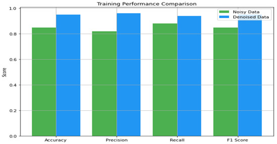 When the methods of denoising were applied to the training performance, a positive deviance was achieved. Figure 11 illustrates the influence of denoising on the classification performance. The accuracy increased to 0.95, depicting that there was 95% correct classification. The precision increased to 0.96, proving that most of the identified patients were positively diagnosed. The recall was a bit lower at 0.94, but the F1 score was 0.95, which enhanced the model’s performance and eliminated bias. These features highlight how the denoising process can help boost the model’s capability of performing learning based on uncontaminated data. The same applied to the testing performance on the denoised dataset, in which critical improvements were also noted. The accuracy was 0.92, the precision was 0.91, and the recall was 0.90, and the F1 score was 0.91.