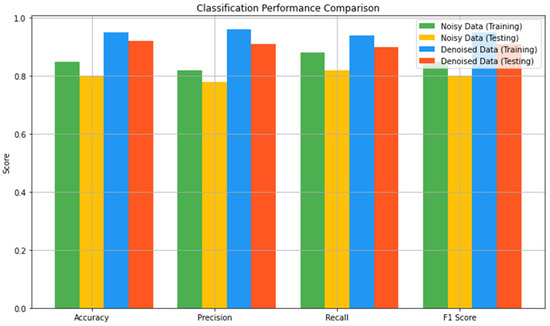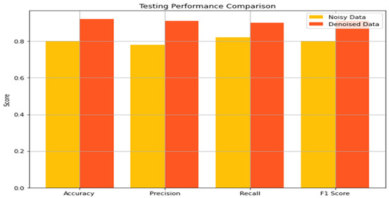 Similarly, precision, which calculates the ratio of true positive to the total positive that was predicted, also recorded significant improvement. Concerning the noisy dataset, while the training precision was 0.82, the testing precision was determined to be 0.78. After denoising, these values were raised to 0.96 for training data and 0.91 for testing data. This shows that the use of denoising will minimize the occurrence of false positives, thereby improving predictability. Recall, which points to the capacity of the model to identify all actual positives, also demonstrated a significant improvement as well. The first noisy set of data captured the training and testing recalls of 0.88 and 0.82 only, but for the denoised set, the training recall became 0.94, and the testing recall became 0.90. From this improvement, it can be concluded that by denoising, the model has higher chances of recognizing real positives or, in other words, decreasing the number of false negative results.