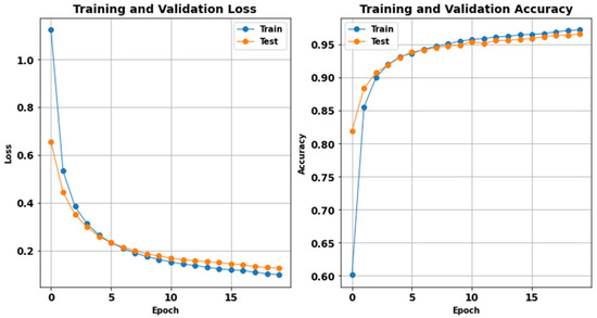 Using the training and validation, loss and accuracy represent the performance of the classification model. Figure 12 offers an understanding of the model’s learning process as well as its capacity to generalize new data. The left graph shows training and validation loss with an increase in epochs up to 20. First, the training and the validation losses are high at the beginning. Still, they rapidly decrease to a very low value during the initial epochs, meaning that the learning process is happening. The training loss drops from around 1.1 to nearly 0.1, while the validation loss decreases from approximately 0.6 to 0.15. This continuous decrease indicates that the model is correcting errors in both datasets: training and validation. The right plot represents the accuracy of training and validation against the number of epochs. The training accuracy gradually rises from about 60% to over 95%, demonstrating a steady enhancement in the model’s capacity to classify the signals correctly. Similarly, the validation accuracy increases over the epochs but remains between 80% and 95%.