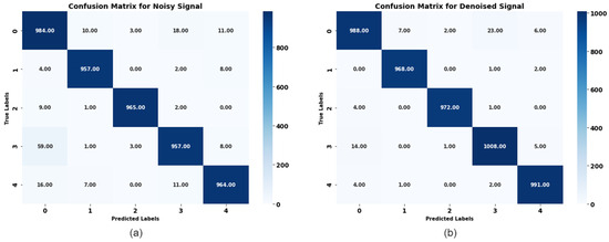 (a) Confusion matrix comparison for a noisy signal. (b) Confusion matrix for a denoised signal.