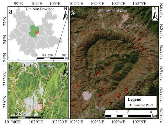 Figure 1. Location of the study area and distribution of sampling points. (a) Yunnan Province, China; (b) Lufeng City, Chuxiong Yi Autonomous Prefecture; (c) Dinosaur Valley.