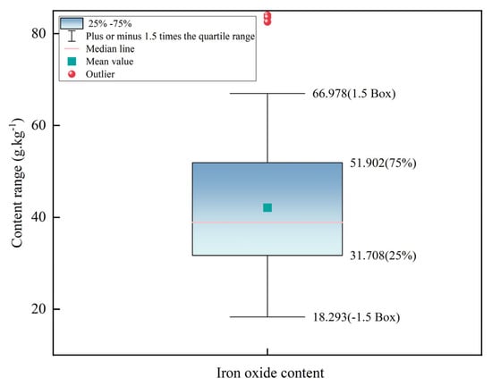 Soil spectral curves are susceptible to random noise, which may come from instrumentation, environment, human operation, and other factors during data acquisition and measurement [23,24]. Random noise in spectral curves can significantly impact the precision and accuracy of the model, necessitating preprocessing of the collected hyperspectral data before modeling. The noisy bands at 300~399 nm and 2451~2500 nm were eliminated, and the main bands at 400~2450 nm with higher signal-to-noise ratios were retained to utilize the hyperspectral results for the inversion study of iron oxide content in soil. Furthermore, in order to prevent the negative impact on the modeling effect due to the existence of outliers in the iron oxide content data, an outlier elimination operation was performed, the box-and-line plot method was used to effectively identify and handle outliers, and three outliers were excluded by setting the judgement criteria to be plus or minus 1.5 times the quartile spacing, as shown in Figure 2.