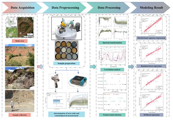 Iron is one of the most abundant metallic elements in the Earth’s crust and is of irreplaceable importance to production and life in human society. In nature, iron commonly occurs in a form resulting from chemosynthesis, such as iron ore and hematite; iron oxides are susceptible to environmental factors due to their high activity, and their occurrence cycle can reflect the process of soil leaching, the degree of weathering and development, oxidative precipitation, and migration, making it one of the important indexes for assessing the degree of soil development and for conducting soil classifications [1,2,3]. In addition, the iron oxide content in soil is a multifaceted and essential indicator that not only is useful in the assessment of soil fertility but also has critical scientific guidance and practical significance for monitoring environmental quality, guiding agricultural management, comprehending biogeochemical cycles, coping with climate change, preventing soil erosion, and restoring ecological soil [4,5]. Therefore, a quick grasp of information about the iron oxide content in soil can provide a scientific foundation for the sustainable development of agriculture, ecological and environmental protection, and rational utilization of land resources, thus promoting harmonious coexistence between human society and the natural environment.