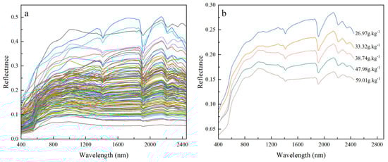 Figure 4. (a) Original spectral curves of soil samples; (b) average spectral reflectance after six equal divisions of the original spectral curve.