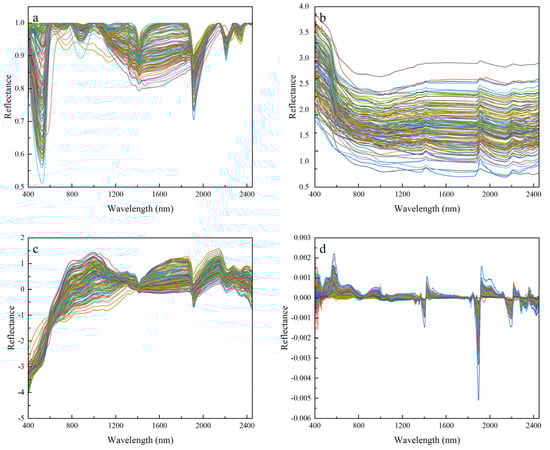 Figure 5. Spectral curve after transforming the original spectrum. (a) CR; (b) RL; (c) SNV; (d) FD.
