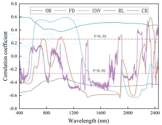 The characteristic band selection based on the CC was carried out with the help of a Pearson correlation analysis of the iron oxide content using OR, and the four transformed spectral reflectances and the number of bands in which OR, CR, FD, RL, and SNV passed the p = 0.01 significance test were 2051, 1425, 1318, 2051, and 1737, respectively. The absolute value of the correlation coefficient’s critical value to reach a significant correlation (p = 0.01) is 0.2613. Soil iron oxide content was significantly correlated with both OR and RL, so the whole band passed the significance test; the significance bands of iron oxide content and CR were mainly concentrated near 400~600 nm, 1200~1900 nm, 2100 nm, and 2300 nm; FD was mainly concentrated in the areas of 400~500 nm, 1000~1700 nm, and 2000 nm; and SNV was mainly concentrated near 400~550 nm, 600~1300 nm, and 1400~2300 nm.