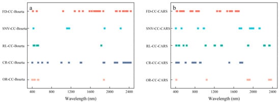 As can be seen in Figure 7, the number of bands further selected using the optimization algorithm is significantly reduced compared to the characteristic bands obtained with the CC. The bands screened by CARS are mainly concentrated in the visible and short-wave infrared bands. The Bourta algorithm effectively eliminates some of the noise and irrelevant information and, therefore, screens a smaller number of feature bands compared to CARS. The Bourta algorithm selectively filters out the distinctive bands located at 500 nm and 900 nm due to the influence of iron/manganese oxides’ absorption. Additionally, it also excludes the bands near 1900 nm due to interference caused by water absorption.