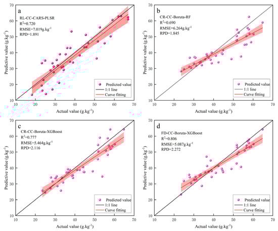 Figure 8. Fitting plot of true values to predicted values. (a) CR-CC-CARS-PLSR; (b) CR-CC-Boruta-RF; (c) CR-CC-Boruta-XGBoost; (d) FD-CC-Boruta-XGBoost.