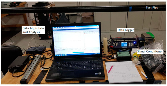 Acoustic pinpointing feasibility testing was conducted on an experimental test pipe consisting of a 19 m long, Schedule-80 carbon steel pipe, (49.25 mm Inner Diameter), the same material used in HPFF pipes. The pipe was coated externally with Pritec (HDPE over butyl mastic; Liberty Coating Company, LLC, Hatfield, PA, USA), the same coating used on HPFF pipes. The pipe’s dimensions and material properties are summarized in Table 1. The measurement system included four B&K accelerometers (Brüel & Kjær North America Inc., Duluth, GA, USA), two B&K two-channel signal conditioners, and one Delphin Expert Transient Data Logger (Delphin Technology AG, Bergisch Gladbach, Germany), with specifications provided in Table 2, Table 3 and Table 4. Figure 1 depicts the test pipe and the components of the measurement system.
