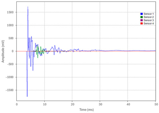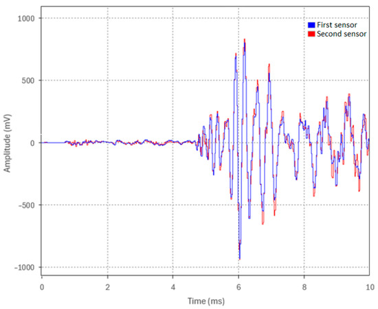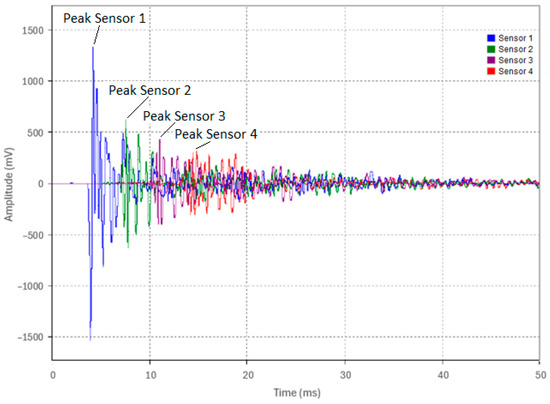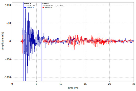 Following the assessment of the backfill material’s impact on acoustic pulse attenuation, we confirmed that a low-amplitude pulse generated by the weight drop apparatus remained detectable after propagating 19 m in the fully embedded pipe. Subsequently, a test was conducted using a fault simulator and a full-scale commercial thumper, which applied a 16 kV voltage charge to simulate a fault thumping event at one-third of the pipe’s length (Location 2). Figure 22 shows the acoustic pulse waveform recorded by the time-synchronized sensors at the pipe’s ends (Sensor 1 in blue and Sensor 4 in red).