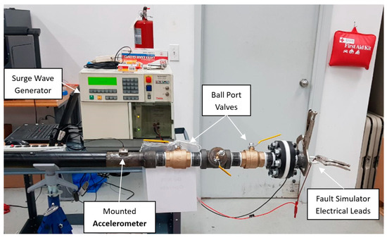 To address these challenges, this study proposes a novel enhancement to conventional acoustic thumping for pipe-type cable systems. Rather than relying on the traditional method of walking the entire cable route with a geophone, the proposed pinpointing approach for pipe-type cable systems involves accessing nearby manholes and attaching acoustic sensors directly to the steel pipe after fault prelocation estimation. This innovative method, inspired by the concept of acoustic leak location as detailed in previous research [24,25,26,27,28], aims to offer a more efficient and accurate means of fault pinpointing. Hydrophones, geophones, and accelerometers were evaluated as candidate sensors for steel-borne acoustic pinpointing [29,30,31]. Among these, an accelerometer-based instrumentation package was identified as offering the best pinpointing accuracy, particularly for detecting acoustic pulses in steel pipes with low damping and a high signal-to-noise ratio [32]. Various signal processing techniques, such as Fast Fourier Transforms (FFTs), Wavelet Transforms (WTs), cross-correlation, and empirical mode decomposition (EMD), have been successfully applied to acoustic wave propagation in pipes [33,34,35,36,37,38]. While these methods can enhance data interpretation, this study focuses on validating direct accelerometer measurements for fault location. Future work may explore the integration of advanced signal processing techniques to further refine the pinpointing accuracy. By utilizing accelerometers in this enhanced setup, the proposed method aims to detect high-frequency steel-borne acoustic pulses with greater sensitivity and provide immediate and significantly improved fault pinpointing accuracy with just a single thump. Additionally, this approach minimizes the potential damage caused by repeated thumping inherent in conventional methods, which often involve manual searching with a geophone.