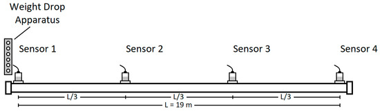 Following verification, the sensors were attached using beeswax to the steel pipe at strategic locations: both ends and at one-third intervals along its length. These positions, referred to as Locations 1, 2, 3, and 4 in the text, correspond to Sensors 1, 2, 3, and 4 shown in Figure 3. This configuration enabled comprehensive data collection along the entire pipe length.