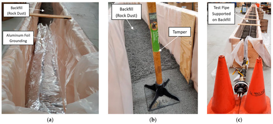 Tamping and layering process: (a) rock dust being poured into the containment box; (b) rock dust tamped in 5–8 cm lifts; and (c) final setup of the pipe laid on 15 cm of tamped rock dust in Test 3.2.