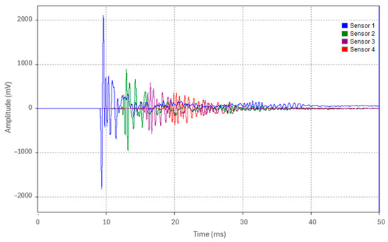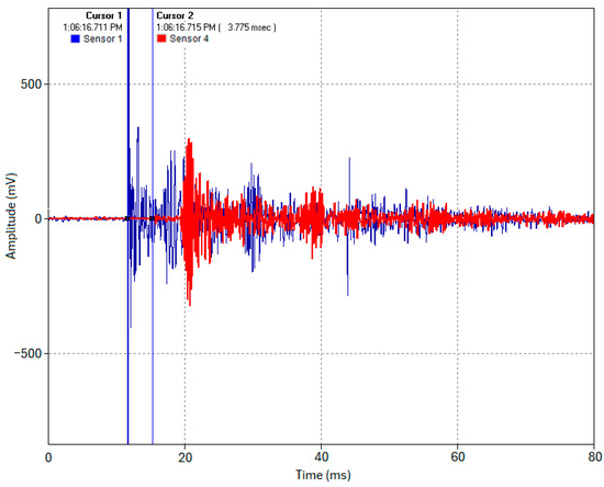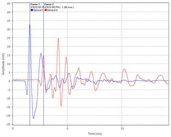 Fault-induced acoustic pulse waveform captured by Sensors 1 and 4 (Test 4).