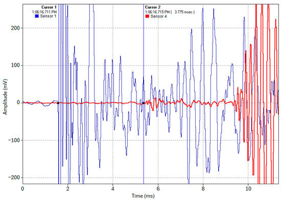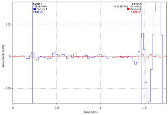 Test 2—blue waveform (Sensor 1); red waveform (Sensor 4).