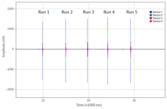 The attenuation of the acoustic pulse is evident, as shown in Figure 16 and summarized in Table 7. Table 7 also shows that the peak amplitudes between runs were consistent, confirming the reliability of the excitation method and the repeatability of the test setup. Using Equation (5), the attenuation coefficient between each sensor pair was calculated in Np/m and is presented in Table 7. The peak amplitude decreased by approximately 52% from Sensor 1 to Sensor 2, 29% from Sensor 2 to Sensor 3, and 31% from Sensor 3 to Sensor 4. This pattern of attenuation was consistent across all five test runs.