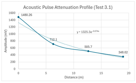An analysis of the Test 3.3 data in Table 9 indicates that the percentage decrease in the peak amplitude was approximately 86% from Sensor 1 to Sensor 2, increasing to 94.3% from Sensor 2 to Sensor 3, and measuring at 66.9% from Sensor 3 to Sensor 4. The overall average attenuation across the 19 m embedded pipe for Test 3.3 was calculated to be 0.327 Np/m, as shown in Figure 21. An increase in the attenuation coefficient of approximately 0.237 Np/m was observed between Tests 3.2 and 3.3. This increase is attributed to the transition from the partial backfill contact at the pipe’s bottom surface in Test 3.2 to complete backfill embedment around the pipe’s circumference in Test 3.3, resulting in significant acoustic energy leakage into the surrounding medium. The data demonstrate that the acoustic pulse amplitude decreased from an initial 1670 mV to 4.7 mV after propagating the entire 19 m pipe length. However, despite this substantial reduction, the pulse remained clearly detectable after traveling 19 m, highlighting the potential viability of this method for long-distance acoustic pulse detection in fully embedded pipe conditions.