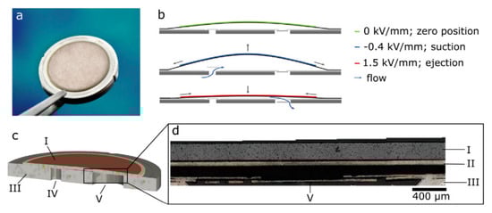 (a) Piezoelectric stainless steel micropump P32009 with diameter of 20 mm and height of 1.5 mm; (b) working principle of the micropump with a piezoelectric actuator and two passive check valves; (c) pump model cross-section with piezoelectric actuator (I), pump body (III), fluid inlet (IV) and fluid outlet (V); (d) microsection of the fluid outlet valve with actuator diaphragm (II) [].