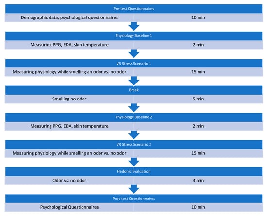The study starts with a survey of demographic data and psychological questionnaires (see Section 2.4). This is followed by a baseline measurement of physiology (2 min), measuring PPG, SCR and skin temperature. After that, the VR Stress Scenario 1 starts, in which event-related odors (vs. no odor) are released (e.g., seeing fire: smelling fire) and physiological reactions are continuously recorded for 15 min. This is followed by a 5 min break in which participants neither see a VR scenario nor smell odors. Then another baseline measurement follows before VR Stress Scenario 2 starts with the same procedure as in Scenario 1. This is followed by the hedonic evaluation of the odors. Finally, a post-test questionnaire is completed.