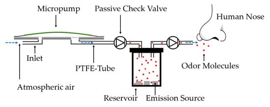 Schematic cross-section of one odor channel consisting of a piezoelectric stainless steel micropump, PTFE-tubing, an odor reservoir with an odor emission source and two passive check-valves. Blue arrows indicate the fluidic path from the atmospheric air inlet to the fluid outlet with odor-enriched air at a close distance to the human nose. Red dots represent odor molecules.