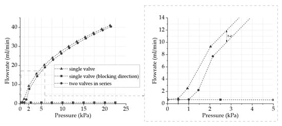 The gas flow rate is measured with one single valve as well as two similar valves coupled in series in flow direction and with one single valve in blocking direction with different inlet pressures. The leakage rate of one single valve in the blocking direction indicates a constant leakage volume flow across all applied pressures. It is, therefore, evaluated as a sensor offset without relevance for further evaluation. The opening pressure of a single valve is approximately kPa, and with two valves in series, the opening pressure is around Pa, resulting in gas flow rates of approx. 2–3 mL/min. With increasing pressures, the flow rate continues to increase with a decreasing gradient. The measurement shows that the behavior of one valve compared to two valves in series is almost identical and only shifted by the higher opening pressure on the x-axis.